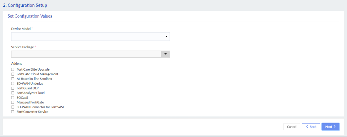 - In the Configuration Setup page, set the service details and click Next. For more information, see Configuration details.