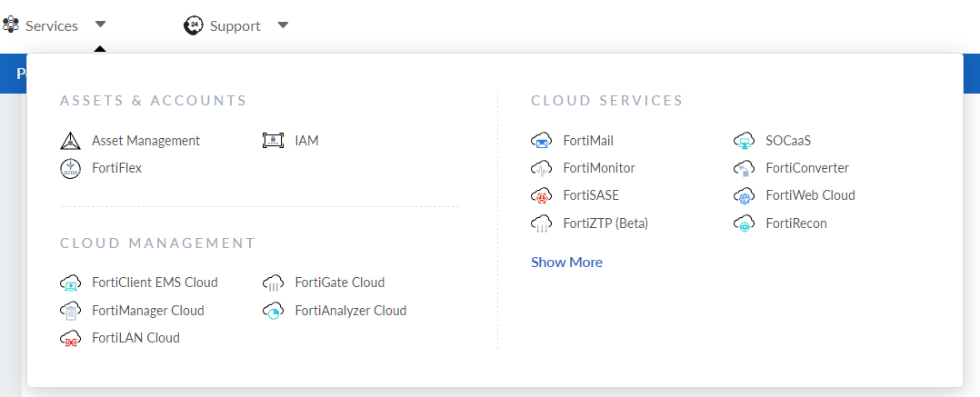 You can access the FortiFlex portal from the Services menu in Asset Management. The FortiFlex option appears in the Asset & Accounts section when there is a valid FortiFlex license.
