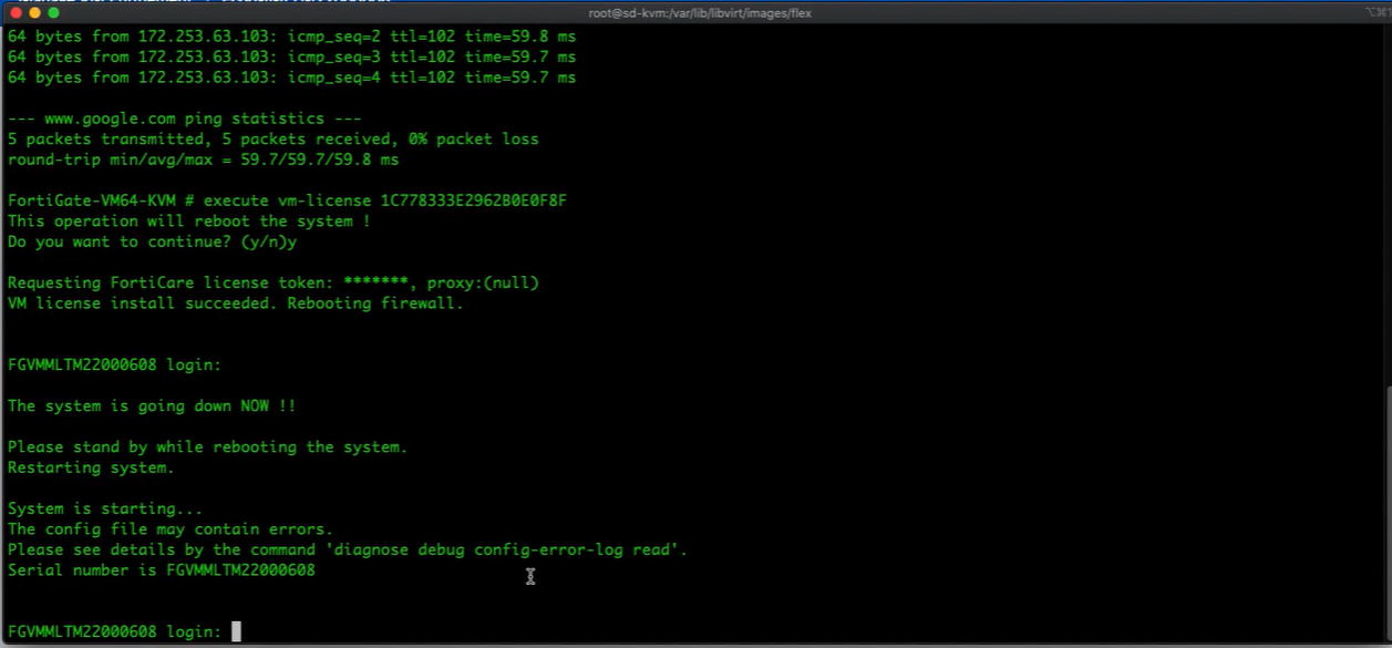 4. When prompted enter y to allow the VM to reboot to activate the new license. The VM reboots and the license is validated against the FortiGaurd servers.