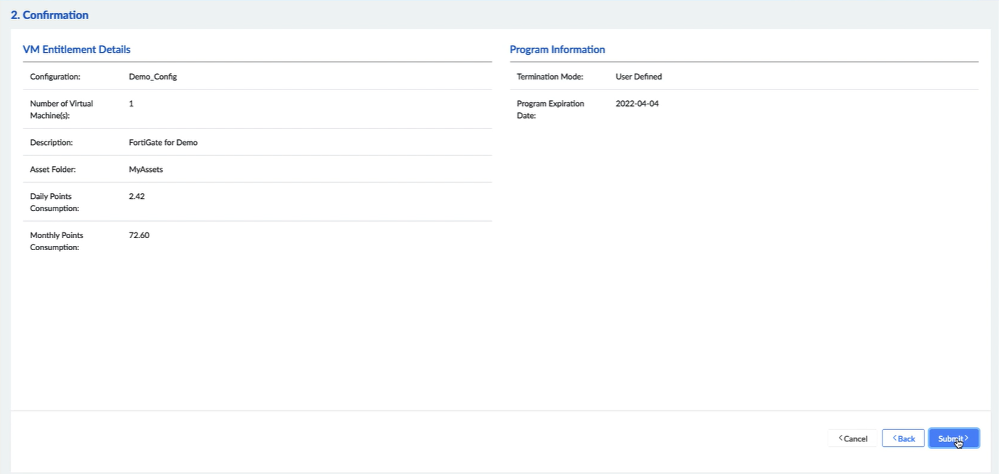 2. In the VM Entitlement Details page, from the Configuration list, select the configuration you created in Step 1 and click Next.