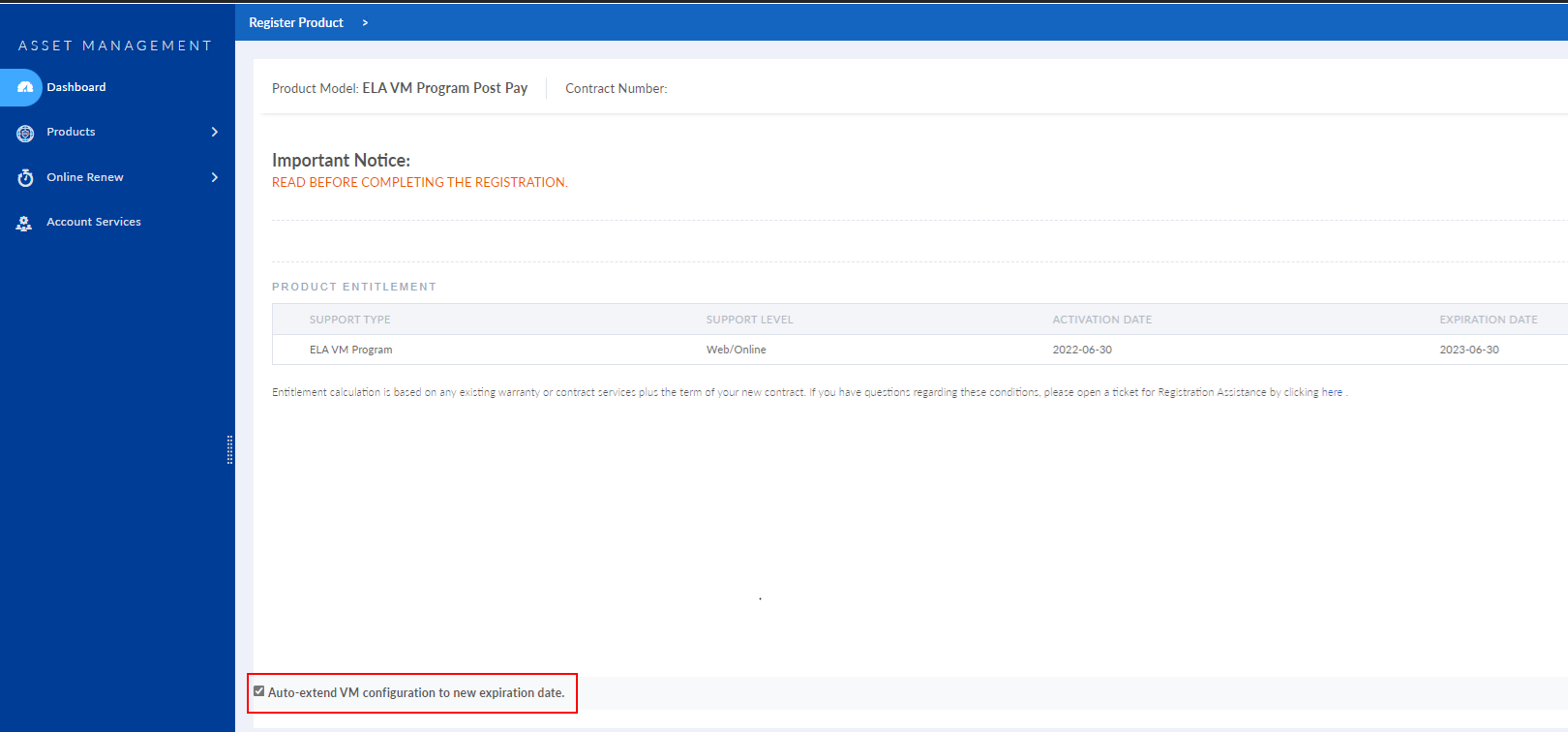 When you register a new FortiFlex contract for renewal, you have the option of selecting Auto-extend VM configuration.