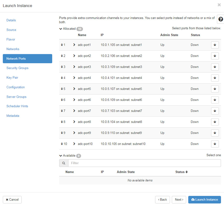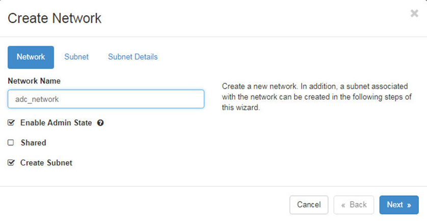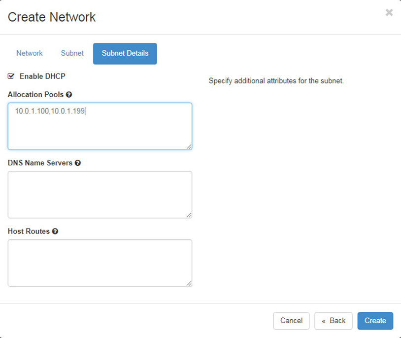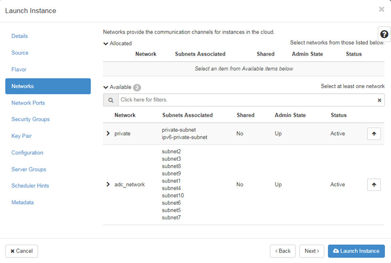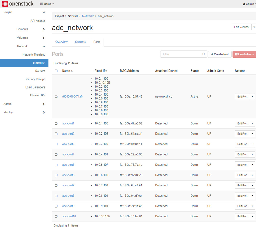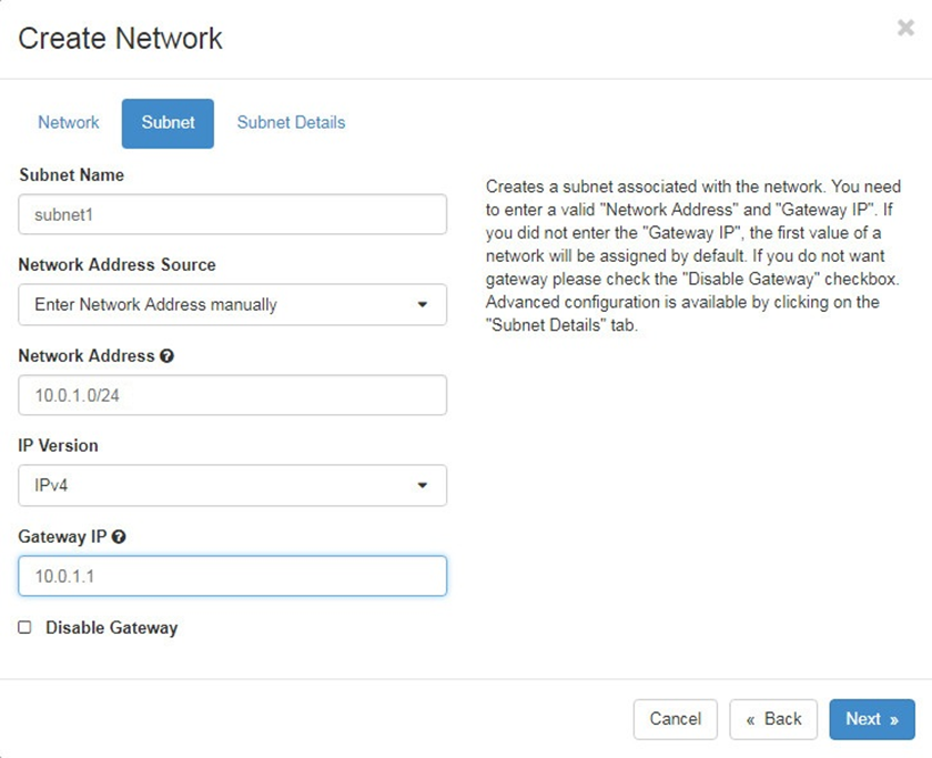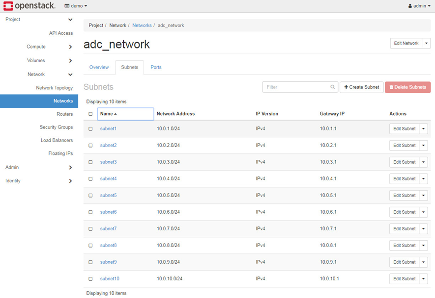 Navigate to Project > Network > Networks. In the network creation wizard, complete the network and subnet settings.to create Network, 10 Subnets and Ports.
