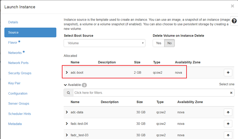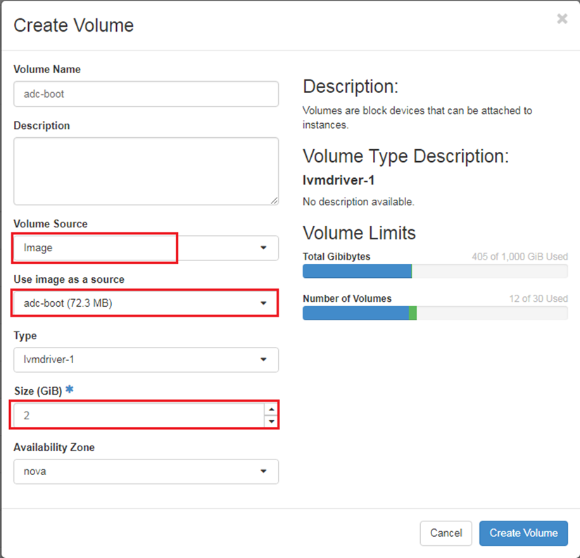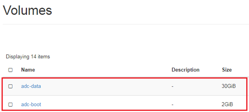 To create the volume FortiADC-VM uses for its boot and log disk, navigate to Project > Volumes > Volumes. This step may take a while.