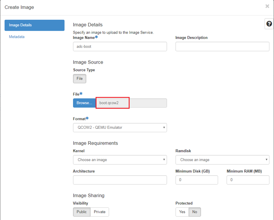 In Project > Compute > Images, use the Image File options to navigate to Image Details and select the boot.qcow2 and data.qcow2 file you extracted from the FortiADC-VM KVM software package. For Format, select QCOW2-QEMU Emulator.