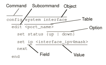 Fortinet documentation uses the terms in Figure 1 to describe the function of each word in the command line.