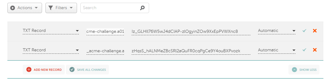 • After you have executed the CLI command to import your automated local certificate, you will be shown the challenge information for each domain. Save this information for use later.