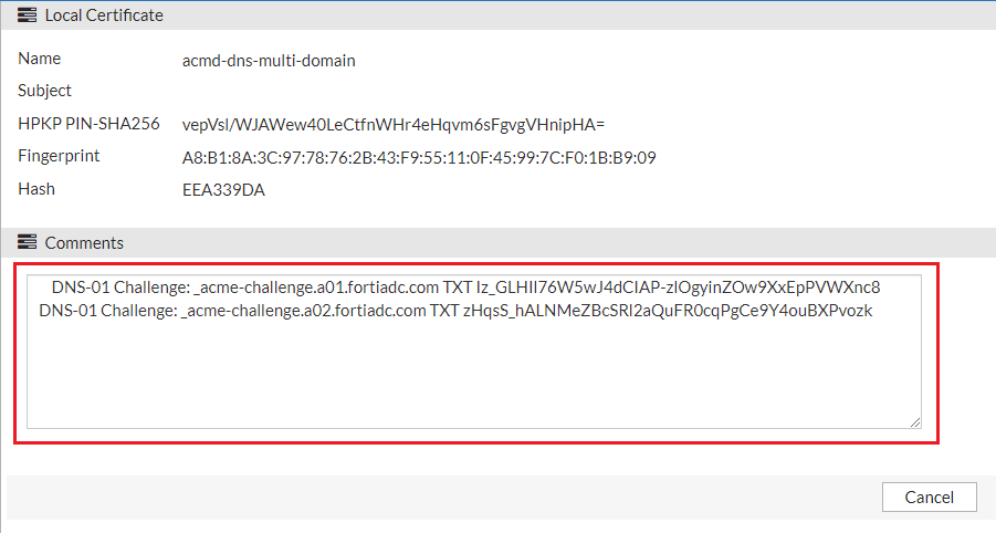 Note: If the DNS challenge information exceeds the 520 character limit, then no records will be displayed in the Comments box. If there are no records in the Comments box, you can view it in the event log.