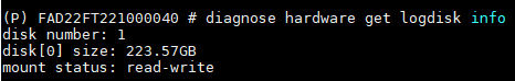 Use this command to retrieve diagnostic information for the log disk used by FortiADC. It reports basic attributes such as device identification, capacity, and status. The output helps verify logging disk availability and detect potential storage issues affecting log integrity or access.