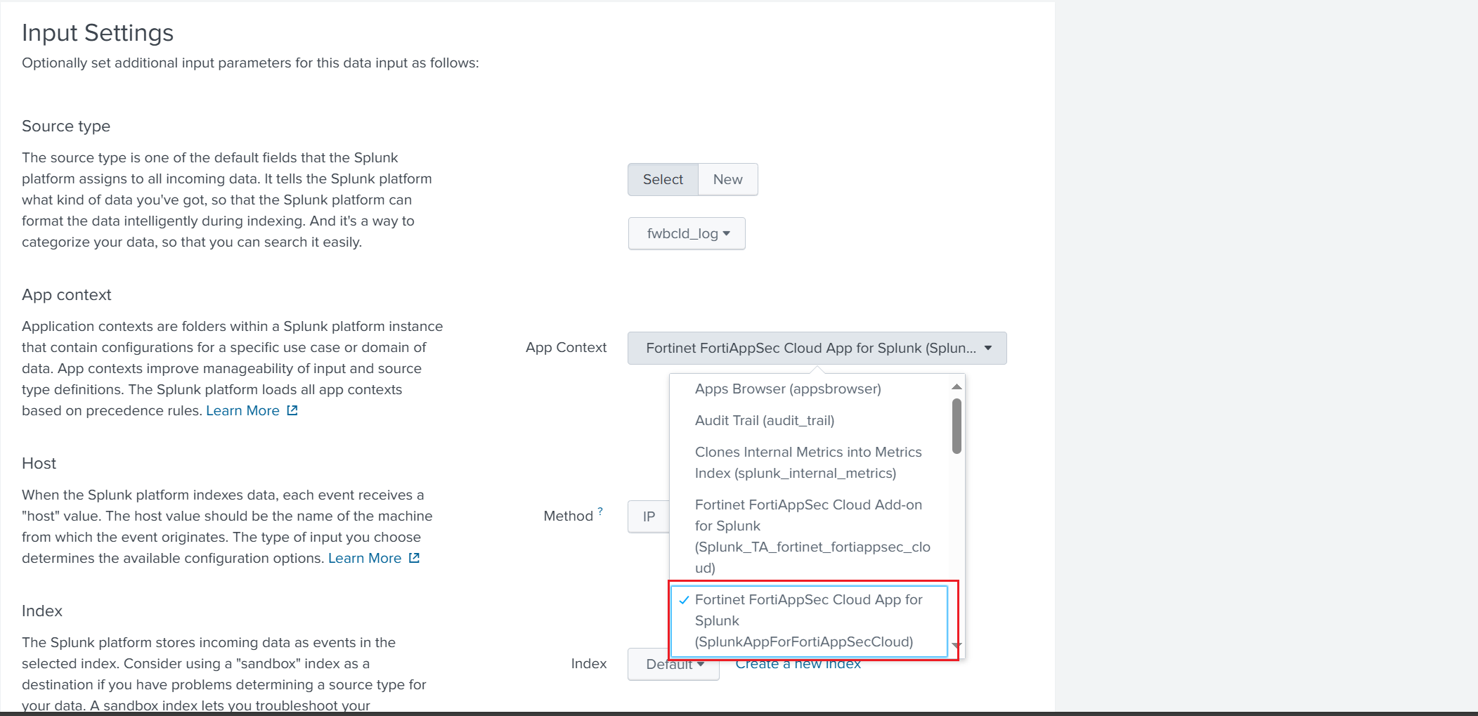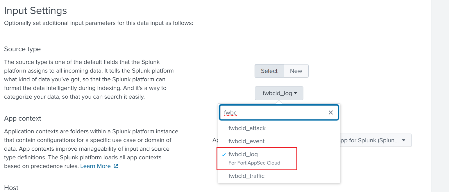 By default, Fortinet FortiAppSec Cloud App for Splunk will automatically extract FortiWebCloud log data from inputs with source type 'fwbcld_log'.