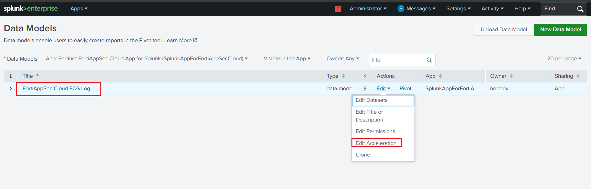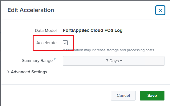 Find FortiAppSec Cloud FOS Log. Under the Actions column, select Edit > Edit Acceleration