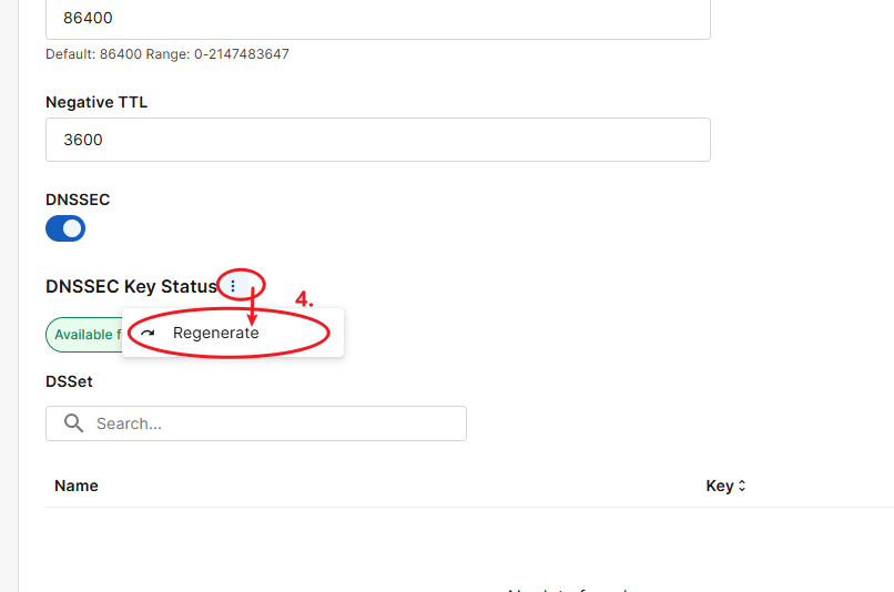 If you suspect your DNSSEC key has been compromised, click the three dots next to DNSSEC Key Status, then select Regenerate. Repeat Step 4 to download the new key before proceeding.