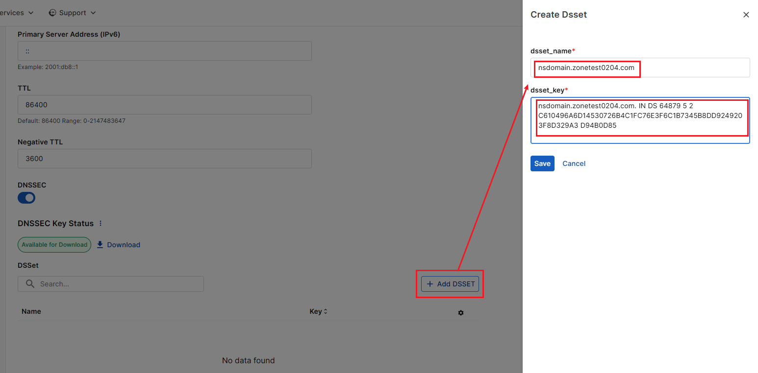 Toggle DNSSEC on to enable it, then save the configuration. The DNSSEC key will be generated shortly after submission.