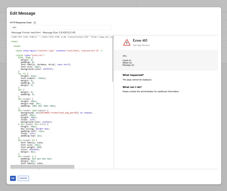 You cannot change macros such as%%SOURCE_IP%%. See Macros in custom block pages. - Click Save to save the changes of the message.