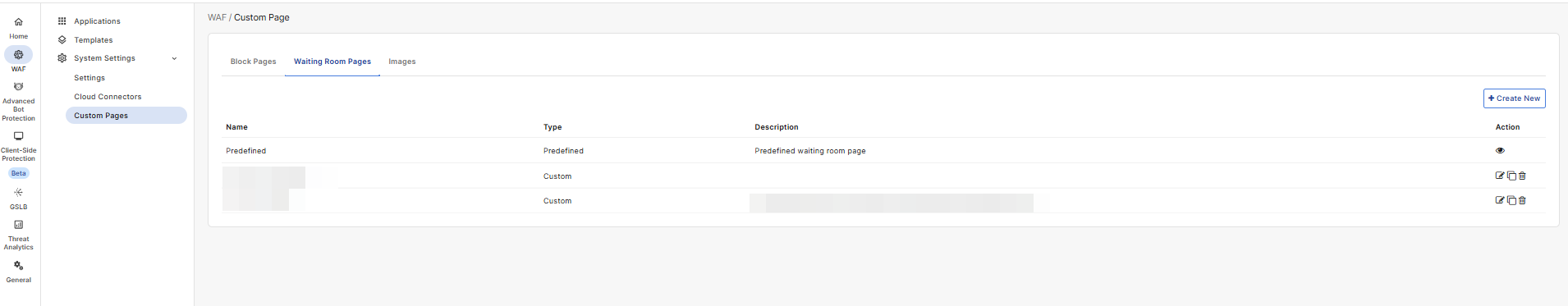 Navigate to WAF > System Settings > Custom Pages> Waiting Room Pages