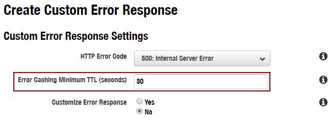 - Click Create Custom Error Response to create a new error page, or click an existing error page to edit its Minimum TTL.