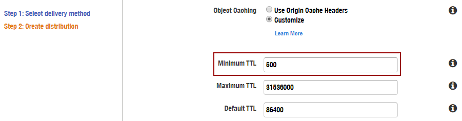 In the following example shown in the screenshots, the Minimum TTL in the distribution is set to 500 seconds, while the Minimum TTL for the error code is set much shorter to 30 seconds. This distinguishes the minimum TTL time for error codes and the rest content. The objects such as the rarely changing icons and background images stay in cache for a long time, while the error codes frequently renews.