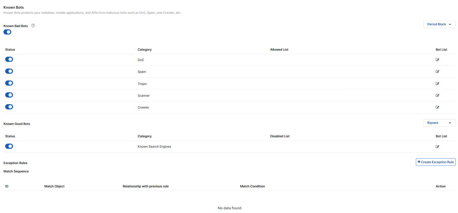 Configuring Known Bots protects your websites, mobile applications, and APIs by blocking known malicious bots (e.g., DoS, Spam, Crawlers) while permitting activity from beneficial bots, such as search engines. This ensures robust security while maintaining the seamless flow of essential traffic.
