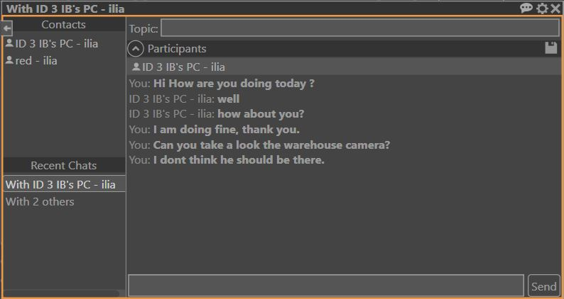 You can chat together with other people that use FortiCentral, unrestricted by your location. Your usernames appear in each other's Contacts list if you: