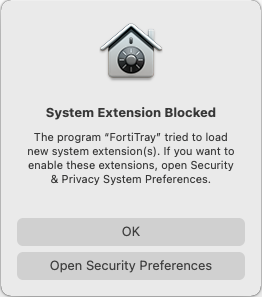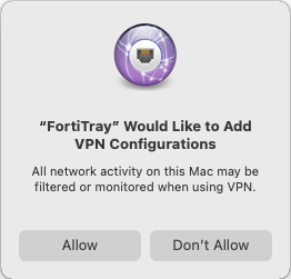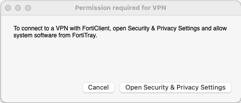 If you do not grant permission to the FortiTray extension or the VPN configuration manager after installing FortiClient, macOS displays a popup whenever you attempt to connect to a VPN tunnel. You cannot establish a VPN tunnel until you grant permissions to the FortiTray extension and VPN configuration manager.