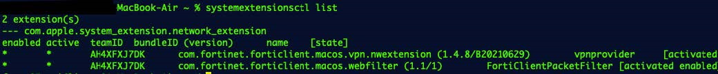 systemextensionsctl listcommand in the macOS terminal. The following provides example output when the extension is enabled: