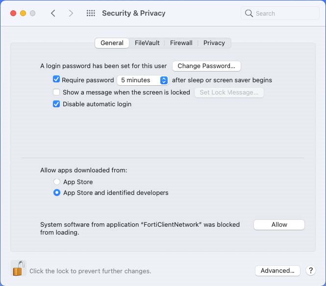 Click the Allow button beside System software from application "FortiClientNetwork" was blocked from loading.
