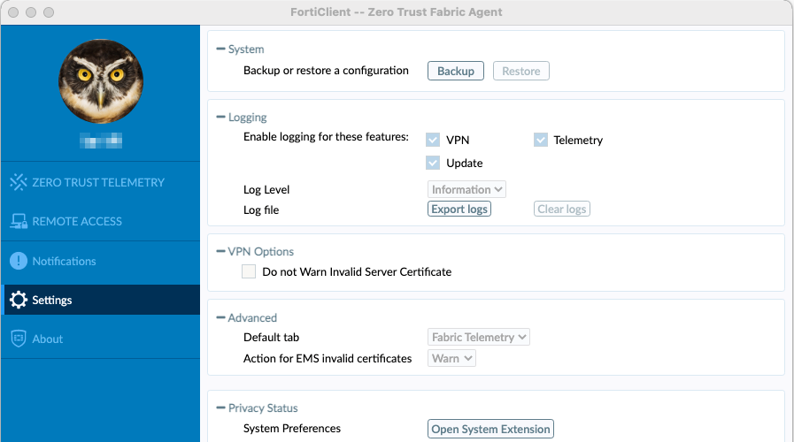 You can also go to the Settings tab and click Open System Extension under Privacy Status. This shows if any FortiClient extensions still require permissions.