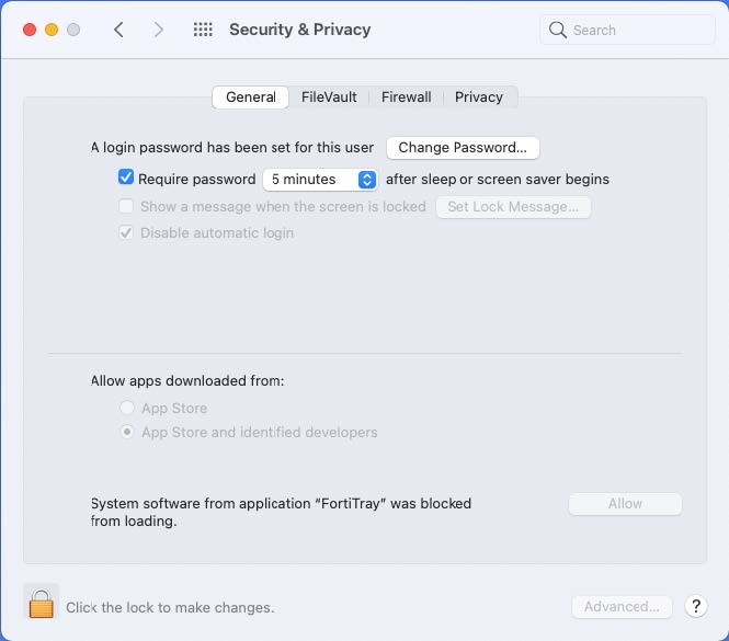 Click the Allow button beside System software from application "FortiTray" was blocked from loading.