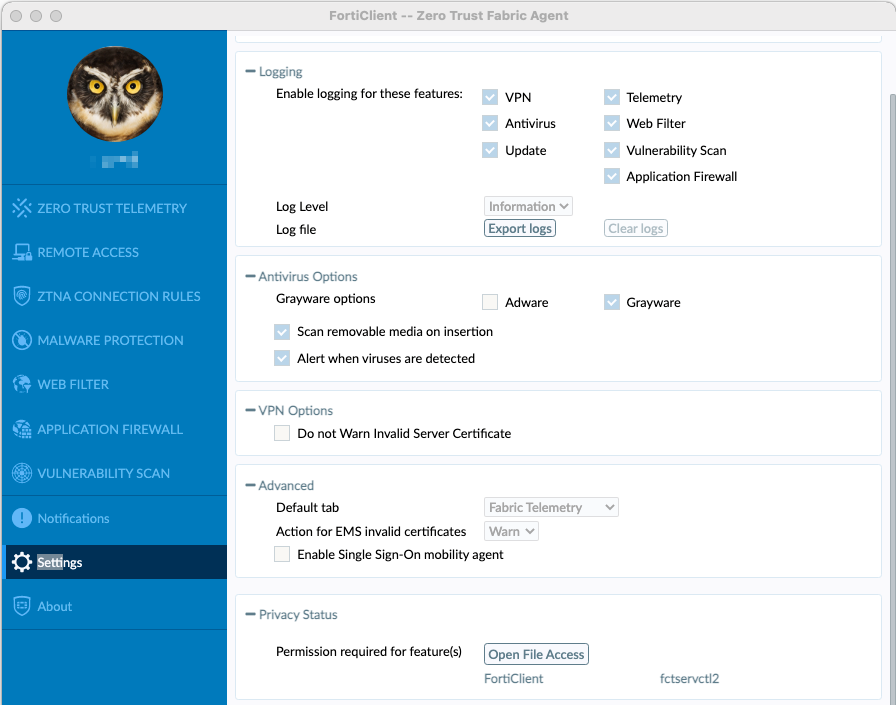 If you did not grant full disk access permissions for the daemons, you can check their status on the Settings tab under Privacy Status. Click Open File Access to grant permissions for the daemons. If you do not configure this, macOS displays a popup asking for permissions each time that you use a feature related to one of the daemons, such as scanning for viruses.