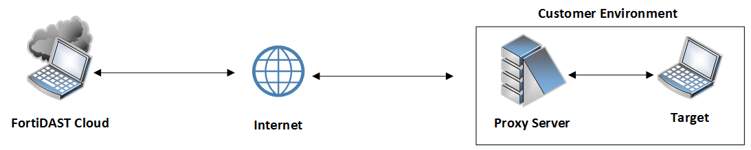You can use proxy servers with FortiDAST to scan internal web applications that are are not exposed to the internet. This is particularly useful in scanning applications-in-development, internal corporate applications, integrating FortiDAST as a DAST scanner in DevOps pipelines, and so on. Deploy the proxy server in your environment as a Docker container, and it runs with minimum manual intervention.