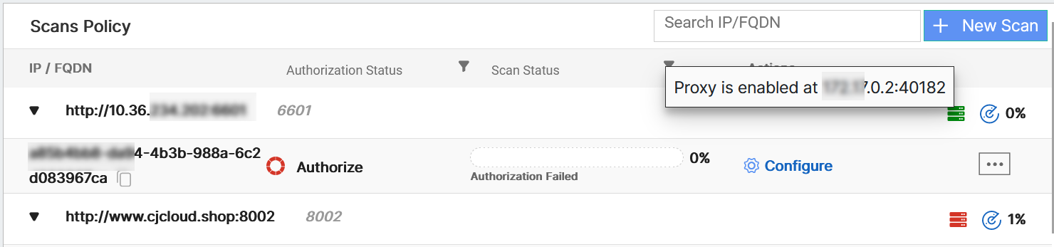 You can view the status of the FortiDAST - proxy server feature in the Scans Policy page. The green icon indicates that communication is established between the proxy server container and the FortiDAST cloud service. Initially, the status is indicated by a red icon, that implies a lack of communication. Hover over the icon to view the port over which the communication is established.
