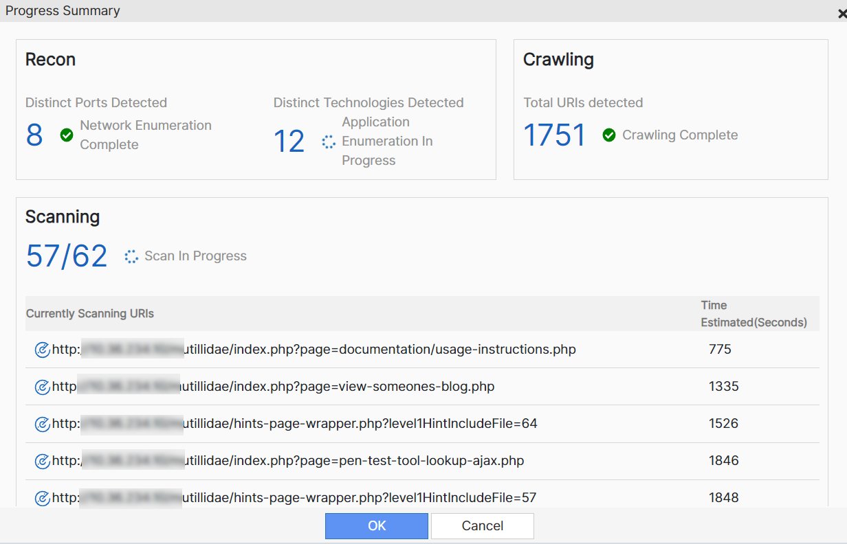 Scanning - Displays the Currently Scanning URIs list along with Time Estimated in seconds to complete the scan.