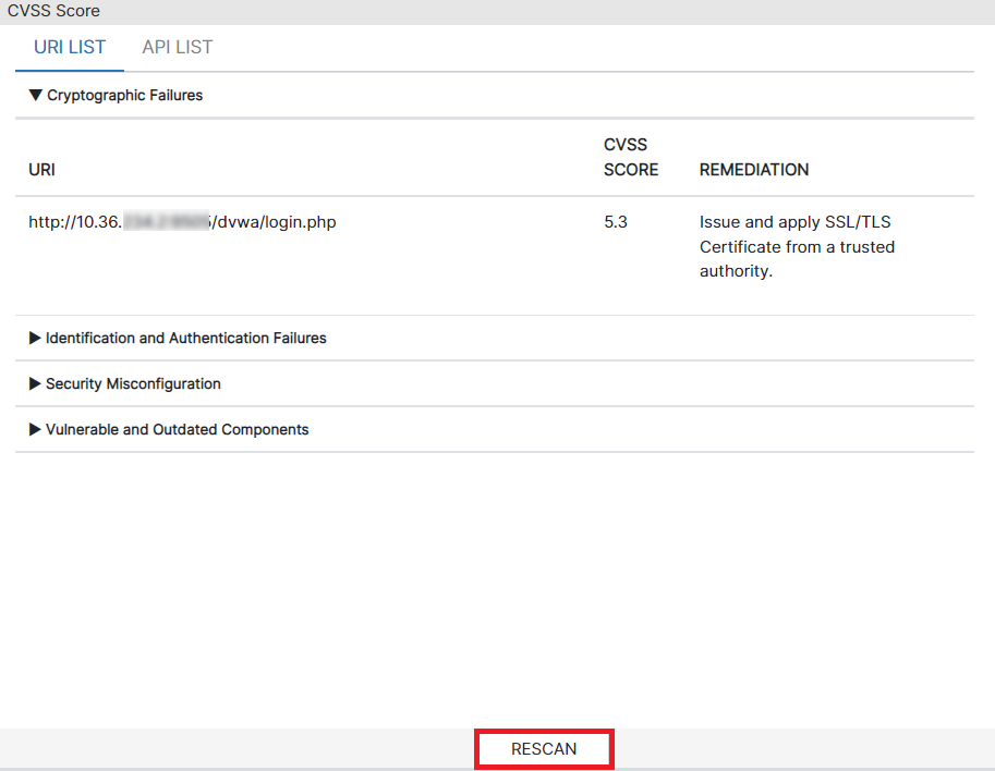 You can rescan vulnerable URIs that score a particular CVSS severity, select the required severity bar and then click Rescan, a partial scan is triggered.