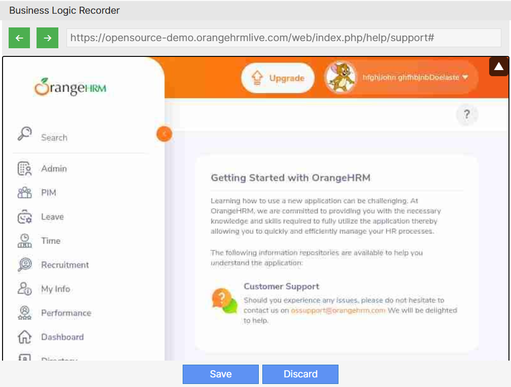 Perform the necessary navigation and actions within the web application and click Save. You cannot use the tab key within the embedded browser. If the back button is clicked multiple times, a blank page may display. Click Discard and start a new recording.