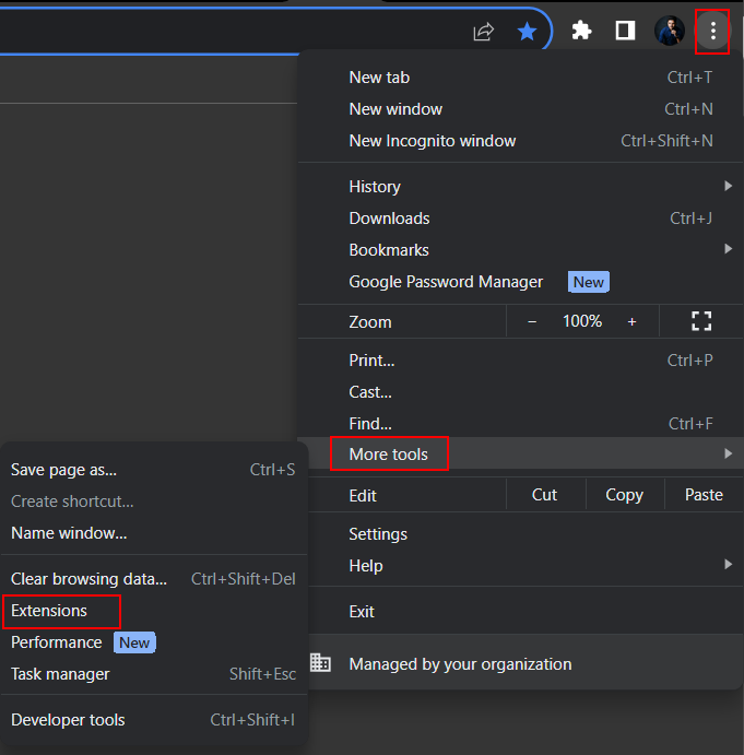 6. Access the extension page. Click menu icon, select More tools and select Extensions on the Chrome toolbar.