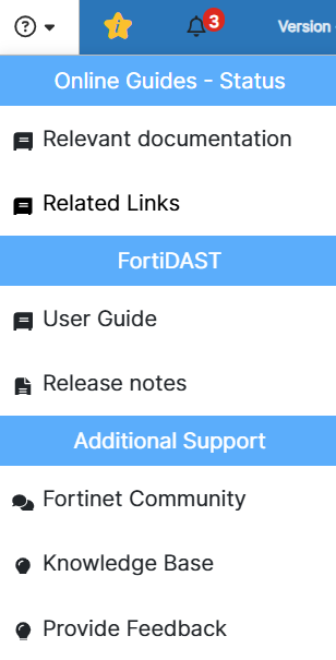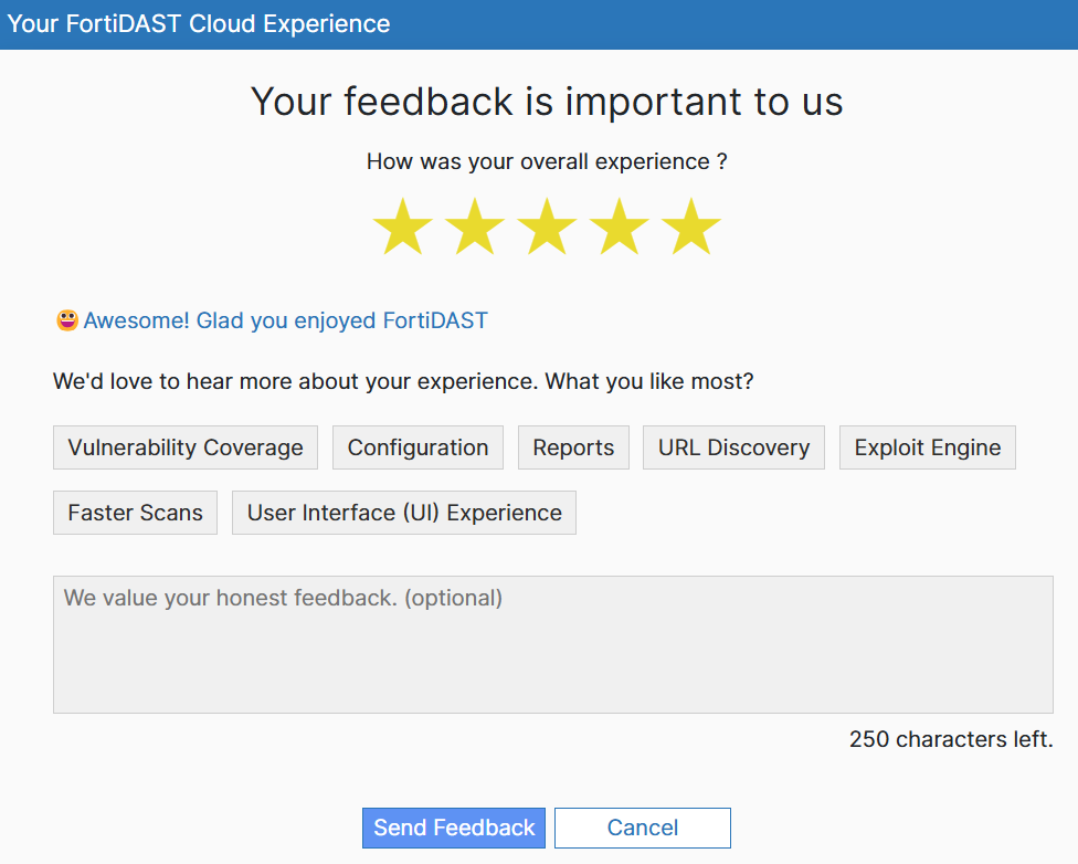 We value your feedback and encourage you to share your thoughts to help us improve FortiDAST. To provide feedback: