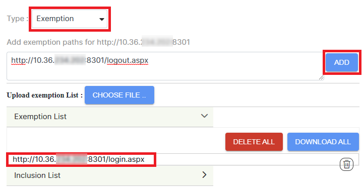 You can exclude one/multiple specific URIs from scanning, for example, you can exclude common user actions such as Logout and Login from the vulnerability scanning. Add the paths or upload a list in the .txt format.