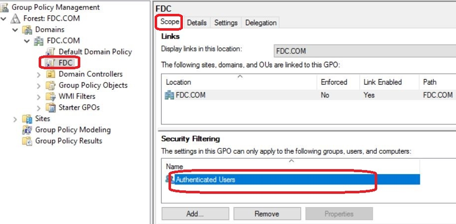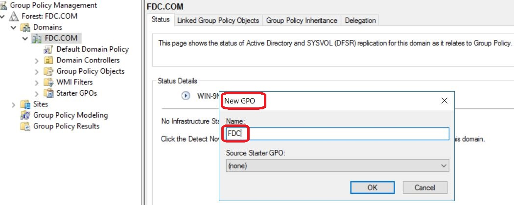 - In the Group Policy Management console, select the new group policy object. In this example, FDC.COM.