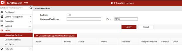 Use Fabric > Integration Devices to view and configure FortiGate and other device settings for integration with FortiDeceptor. Integration uses REST APIs, XML APIs, or webhooks. When decoys are accessed, FortiDeceptor makes quarantine calls and attackers are immediately quarantined on the device for further analysis.