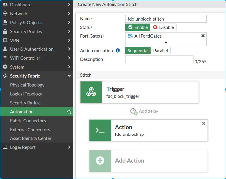 In FortiGate, go to Security Fabric > Automation and verify the Status for the block and unblock webhooks are Enabled.