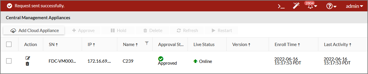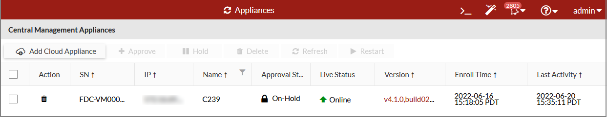 - On the Management Device, go to Central Management > Appliances. The Approval Status for the Remote Client will display On-Hold.