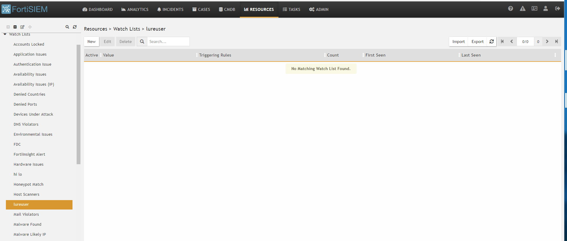 - In FortiSIEM go to Watch Lists and click New to create a new watch list or edit an existing Watch List. For more information, see Managing Resources > Watch List > Creating a Watch List in the FortiSIEM User Guide.
