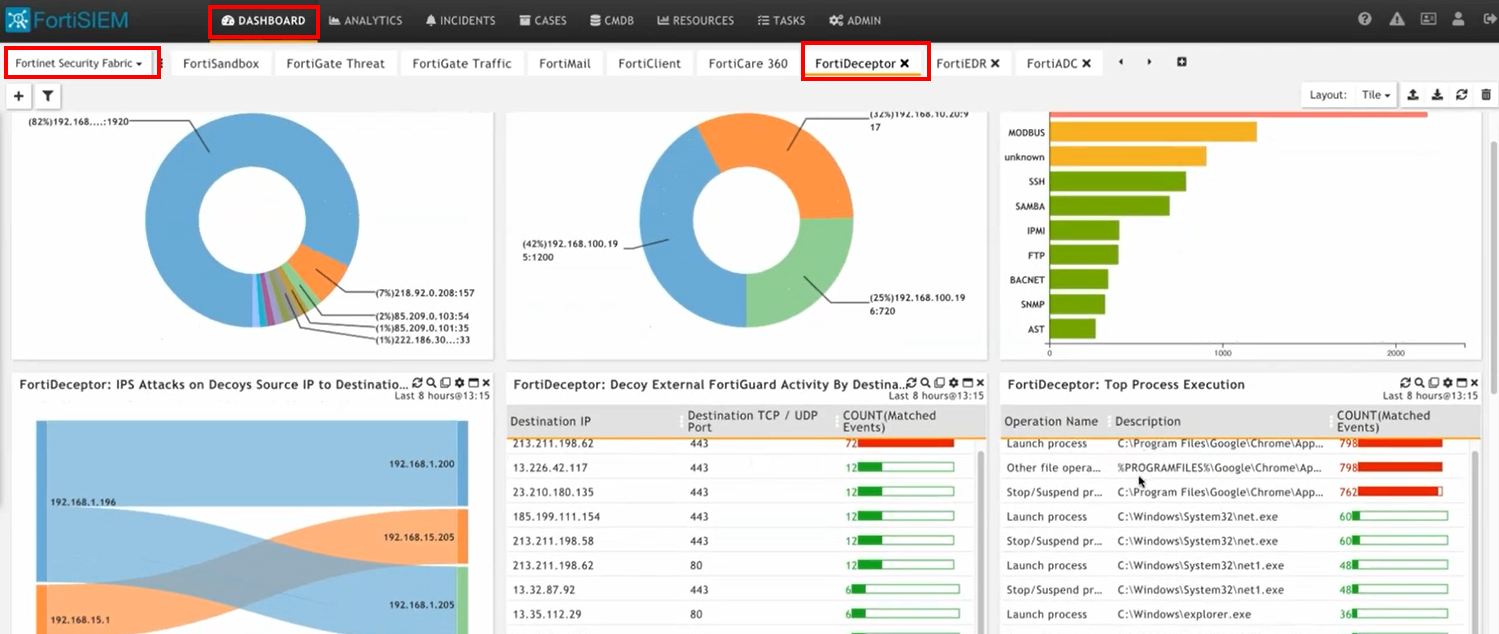 1. In FortiSIEM click the DASHOBARD tab, the Fortinet Security Fabric dashboard, and click the FortiDeceptor dashboard. The information received from FortiDeceptor is displayed. You can click on any widget to drill down on the information.
