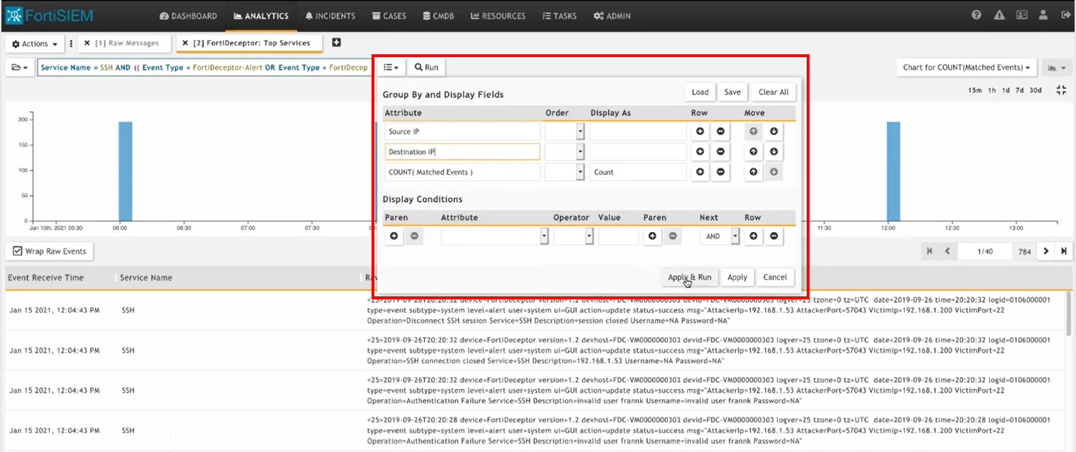 3. Use a Group By and the Display Fields template to view the Source IP and Destination IP.