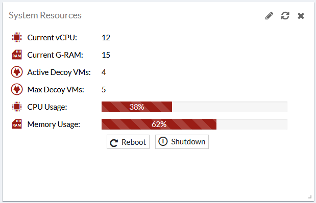 The System Resources widget displays basic information about the FortiDeceptor system, such as the serial number, system up time, and license status information. Use the System Resources to reboot or shutdown the unit.