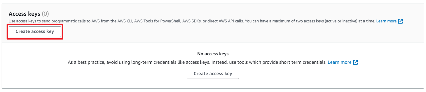 - Under Access keys click Create access key.