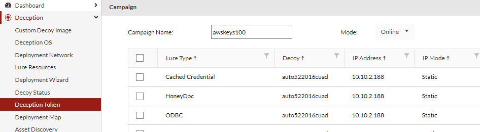 - Go to Deception > Deception Token > Token Campaign.