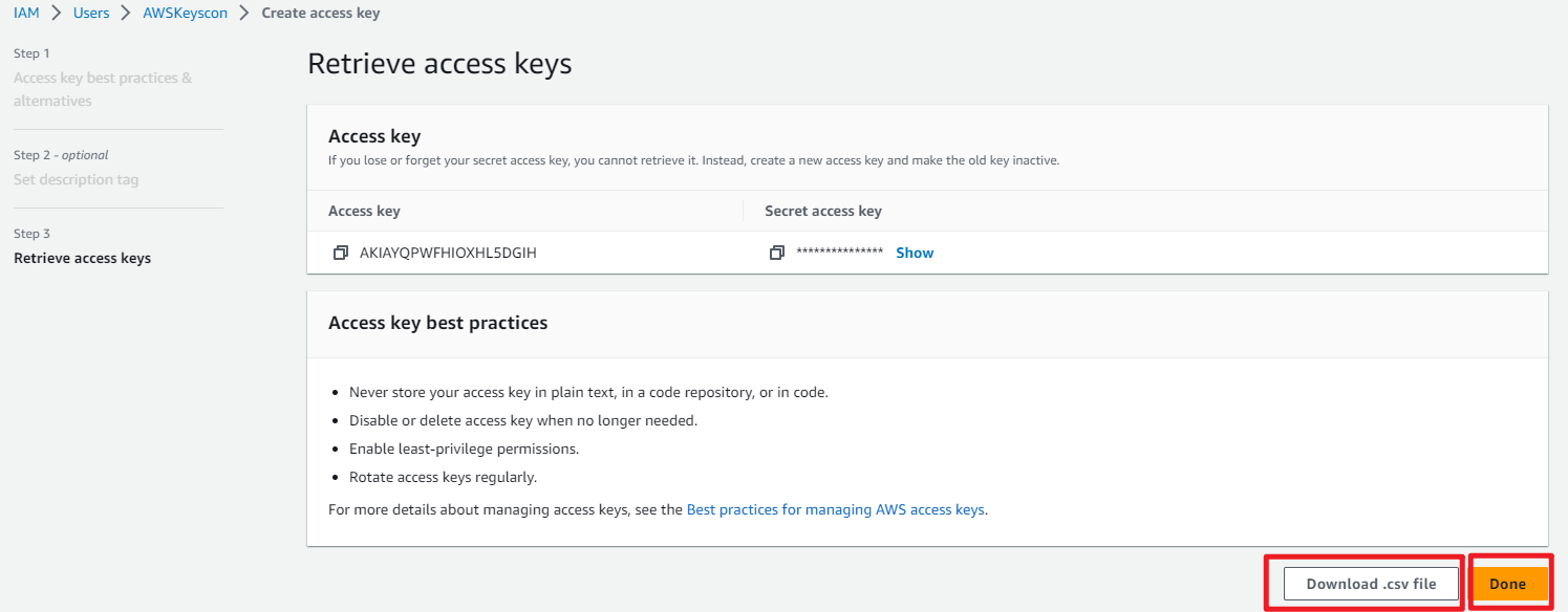 - On the Retrieve access keys page, click Download .csv file and then click Done.