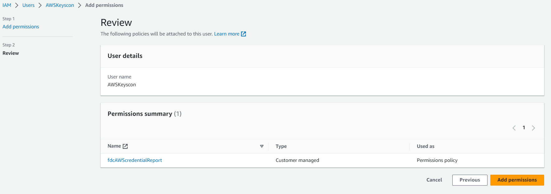 - In the Permissions tab, ensure the AWS Keys Connector has the following two permissions: AWSCloudTrail-ReadOnlyAccess and the custom policy such as fdcAWScredentialReport.