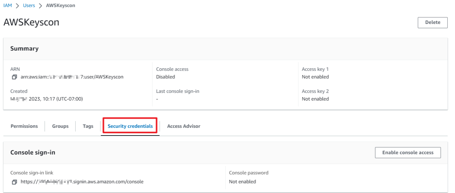 - Go to IAM users and select a user such as AWSKeyscon, and then click the Security credentials tab.