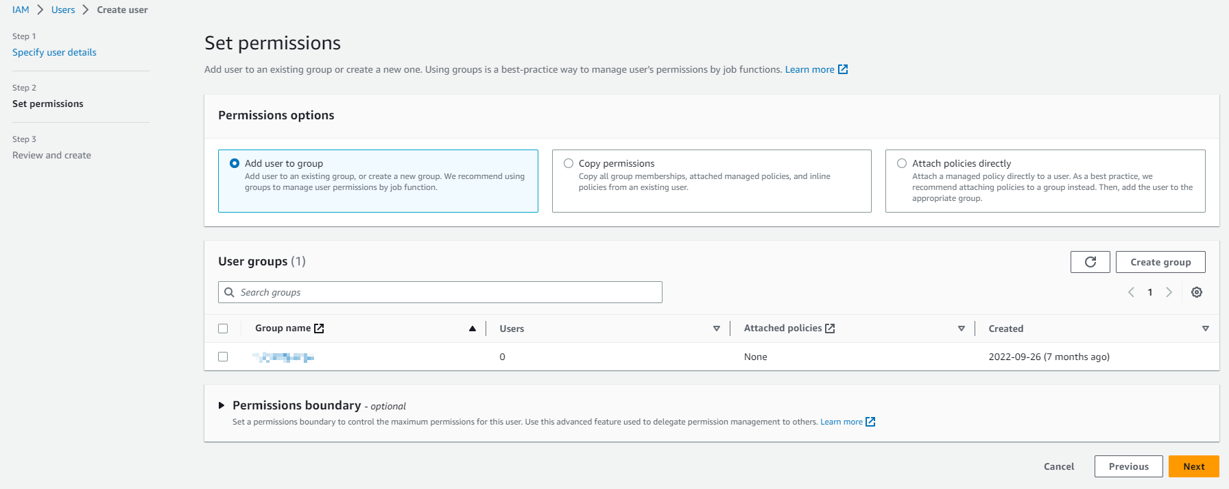 - Set the permissions to Attach existing polices directly and select AWSCloudTrail_ReadOnlyAccess.